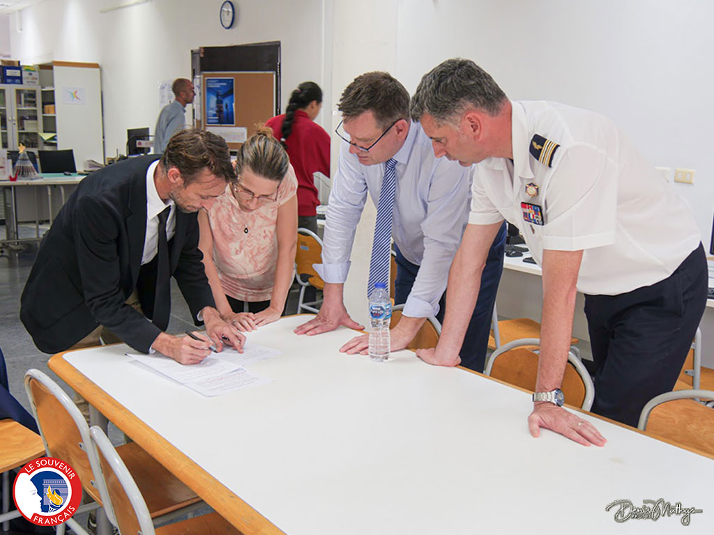 A l’issue d’une Marseillaise vibrante, une convention de dépôt du drapeau a été signée par le LFIB, le Souvenir Français et le Représentant de l’Ambassade, concluant la Cérémonie.
